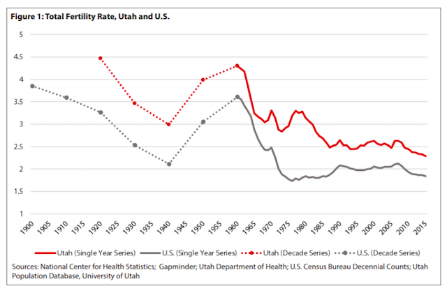 Has the economic crisis of 2007-8, which depressed fertility across the western world, hit the LDS church harder? This is the argument of Lyman Stone, who uses CDC data to show that, in 2015-16, fertility fell faster in Mormon-majority Utah than almost anywhere. However, as Conrad Hackett at Pew suggests (see figure 1), the CDC data seem to show that Utah is merely following the national pattern.