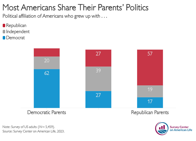 The people most likely to take on the political identity of their parents are those raised in politically cohesive and active families. Americans raised by parents who consistently voted for one party are far more likely to adopt their parents’ politics. Sixty-two percent of Americans raised by parents who consistently voted Democratic identify as Democrats today, while 57% of those who had Republican-voting parents report being Republican.
