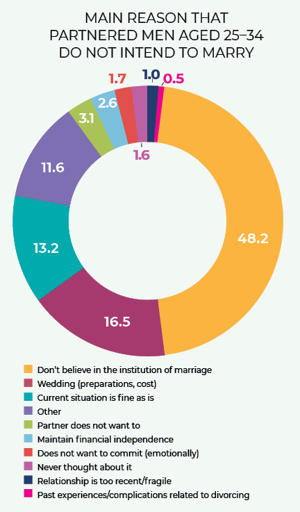 - Half of partnered men and two out of five women selected “don’t believe in the institution of marriage” as the main reason for their decision not to get married. Post This