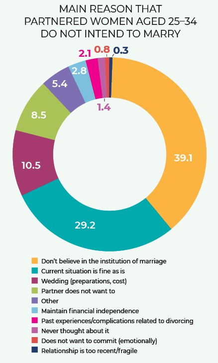 Our most intriguing finding was among partnered young adults choosing to forego marriage. Half of partnered men and two out of five women selected “don’t believe in the institution of marriage” as the main reason for their decision not to get married.
