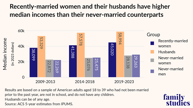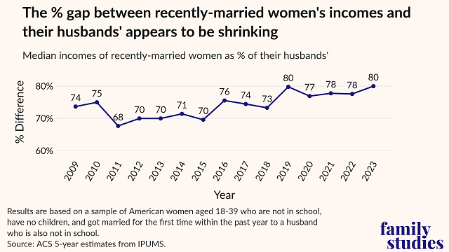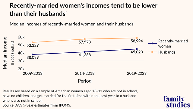 The median income of recently married women (in 2023 dollars) did grow from $38,099 during 2009-2013 to $45,020 during 2019-2023, a sign of women’s rising economic fortunes. However, their husbands' median incomes also increased from $53,329 to $58,994 during that same timeframe, thus maintaining an income gap between these groups.