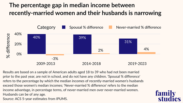 However, this spousal income gap has been narrowing in recent years. While recently-married women's husbands earned 40% more than they did during 2009-2013, this gap decreased to 31% during 2019-2023. Meanwhile, the percentage difference in median income between never-married men and women has remained quite steady.7