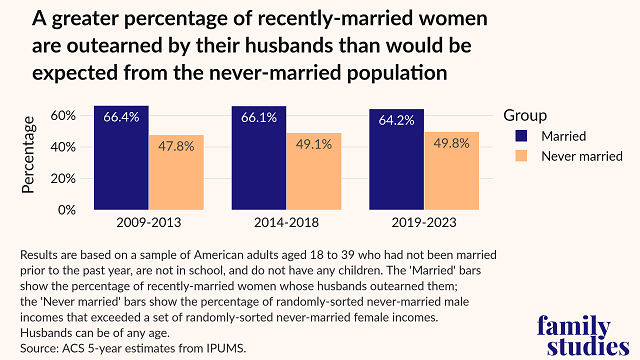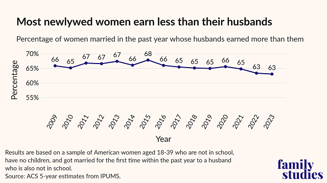 In 2023, 63% of recently married young-adult women were outearned by their husbands, 32% earned more than their husbands, and 5% had the same income.3 The percentage of women who married higher-earning husbands has changed little since 2009, when it was at 66 percent.