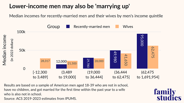 Recently married men in the lowest two income categories also have lower median incomes than their wives, suggesting that they, too, may be 'marrying up.' Even so within each quintile, the median incomes of these men's wives are much lower than are those of recently-married women's husbands. This suggests that hypergamy is more prevalent among women than men.