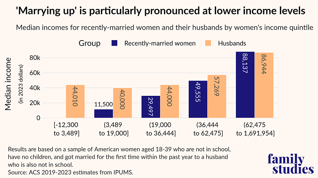 From 2019 to 2023, the majority of women in each of the four lowest income quintiles married higher-earning men. However, a sizable percentage of women in the highest quintile (43%) also married men whose incomes exceeded their own.