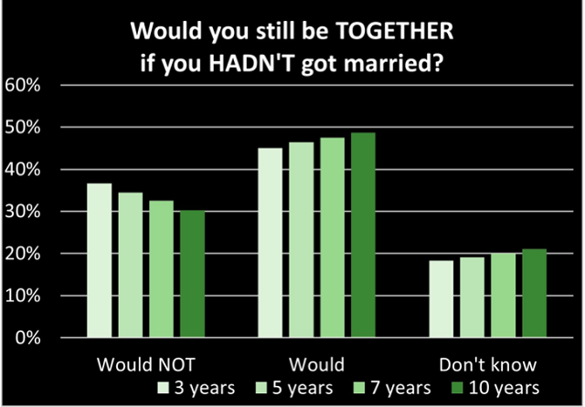 Are the half of married couples who reckon they would have stayed together even if they had remained unmarried saying that getting married didn’t matter? Maybe. But it’s hard to believe these powerful reasons didn’t add any cement whatsoever to the foundations of their life together.