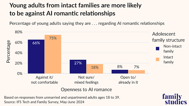 - 75% of unmarried and unpartnered young adults from intact families say they are against or uncomfortable with AI romantic relationships, vs. 66% of those from non-intact families. Post This